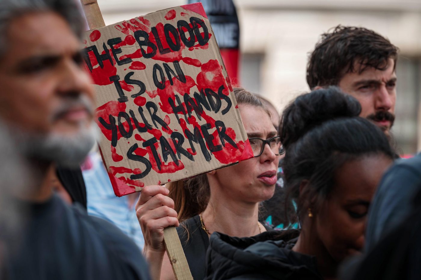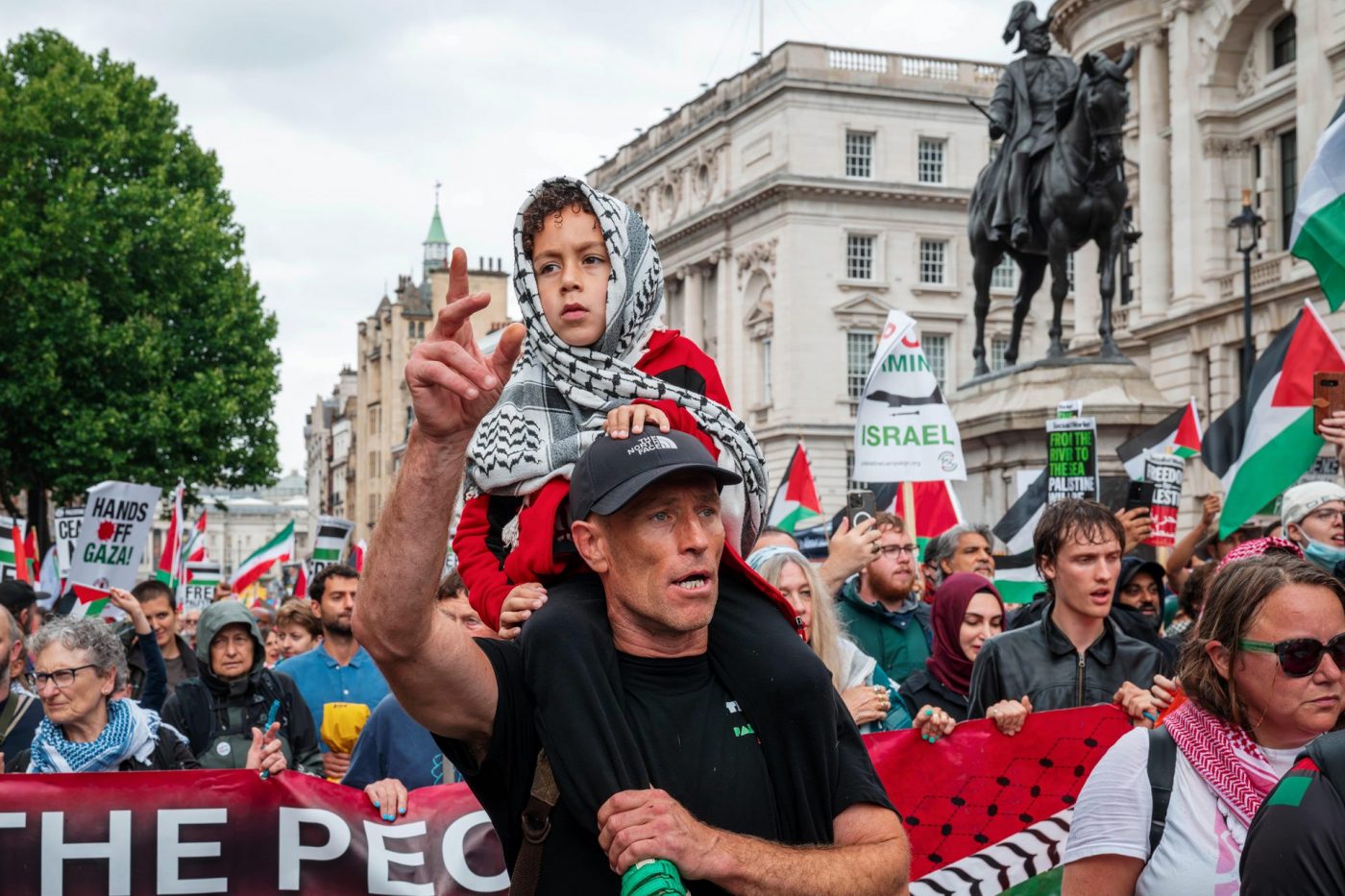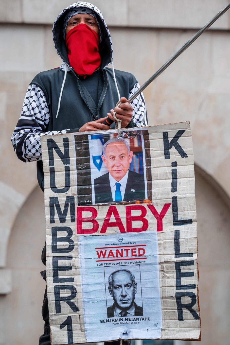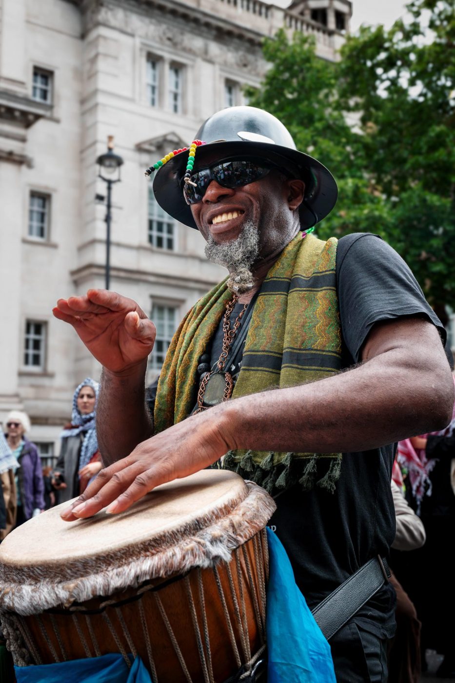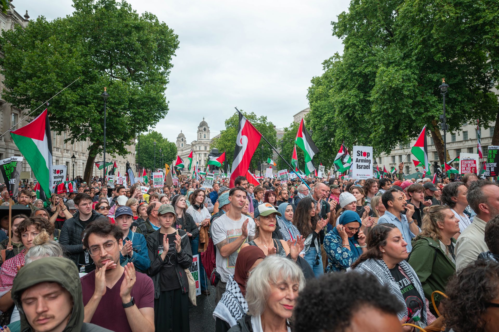London, 19th July 2025. The face of protest. The National March for Palestine brought thousands of people out onto the streets to voice their opposition to the continuing death and destruction of the Palestinian people in Gaza and the West Bank.