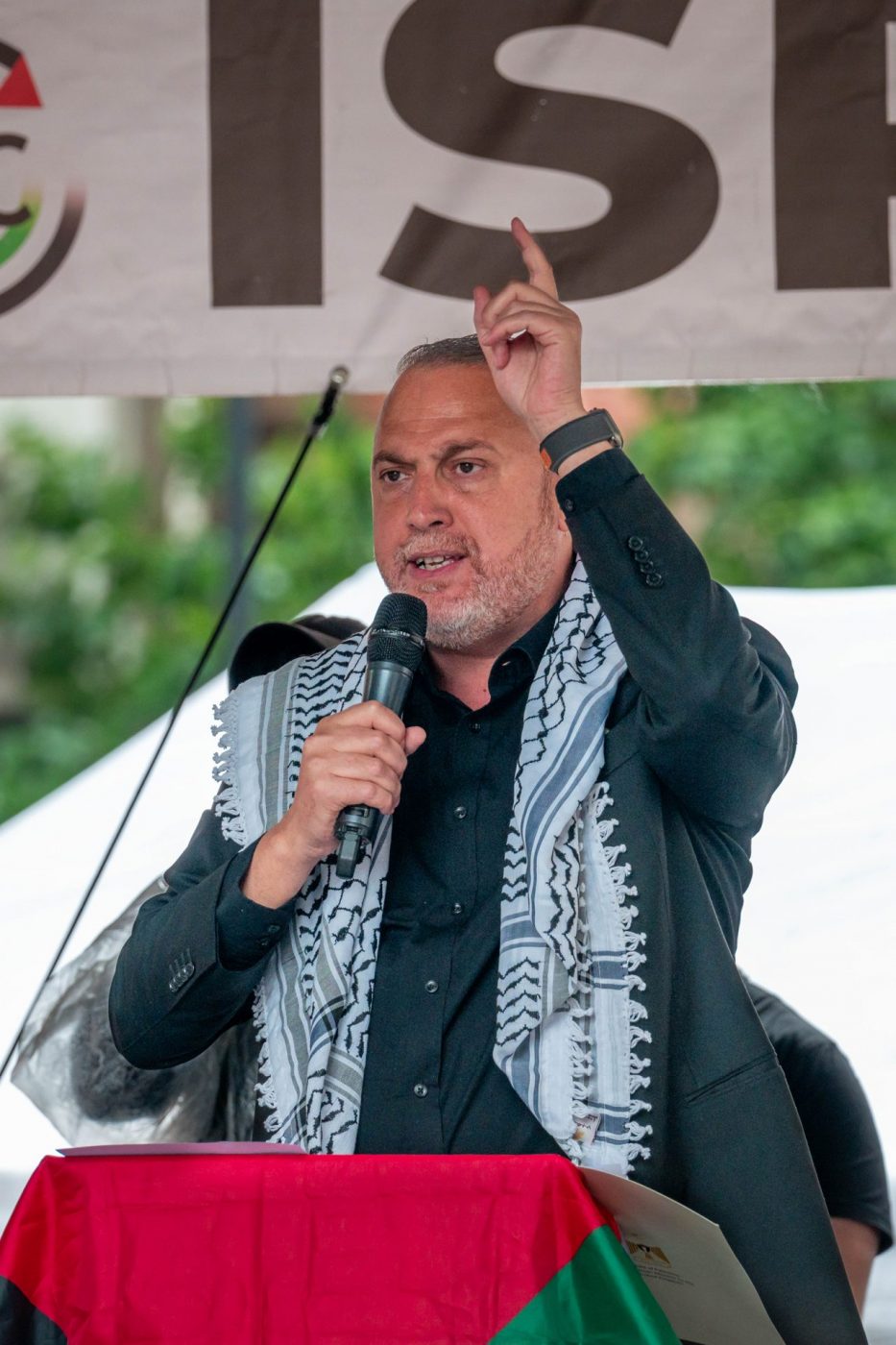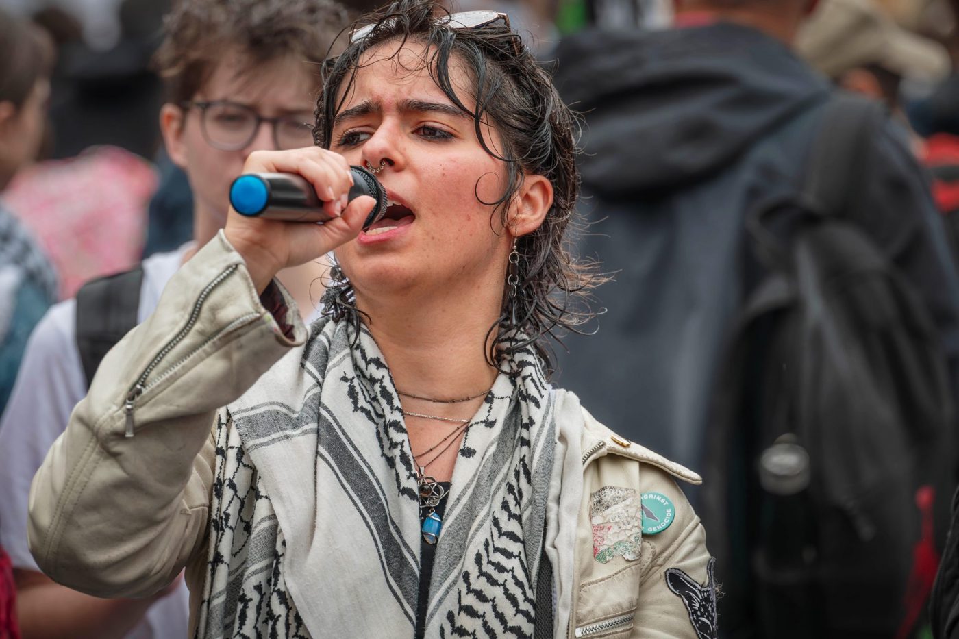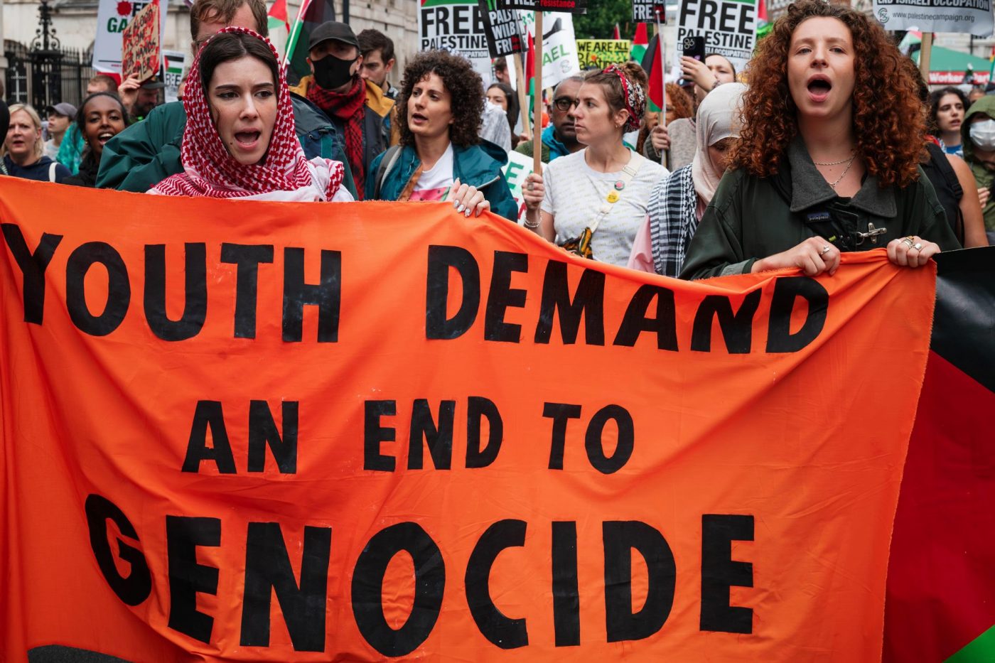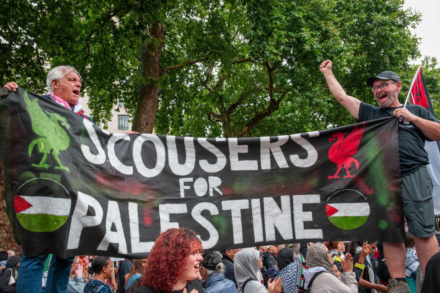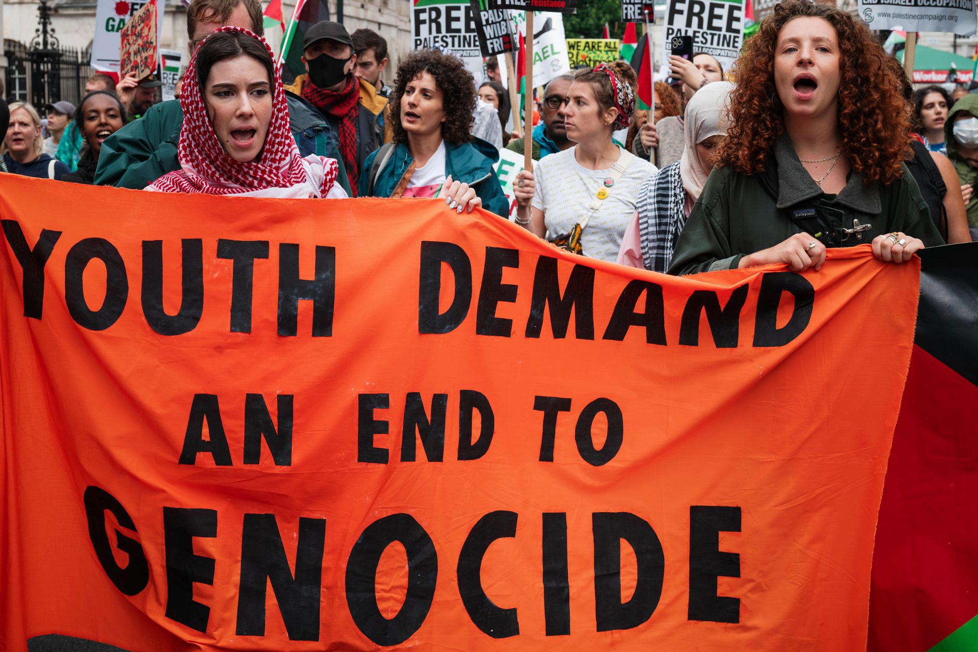 London, 19th July 2025. The face of protest. The National March for Palestine brought thousands of people out onto the streets to voice their opposition to the continuing death and destruction of the Palestinian people in Gaza and the West Bank.